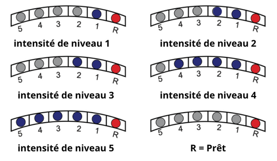 - Notez qu’au redémarrage, l’intensité revient automatiquement au niveau 1.
