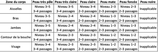 6.2.5 Pour connaître les suggestions de niveaux d’intensité selon les types de peau et les zones du corps, veuillez vous référer au tableau comparatif ci-dessous.